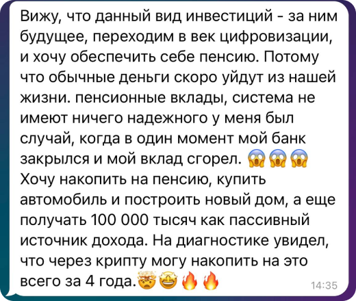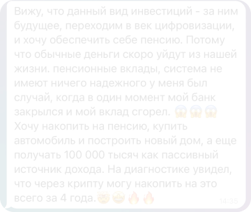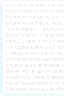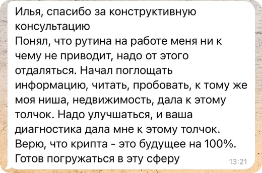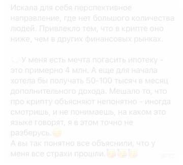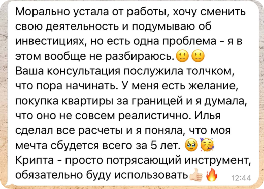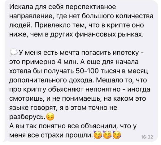 Вы определите собственную стратегию для заработка и инвестиций в криптовалюту. Поймете, что конкретно делать чтобы быстрее реализовать свои цели.